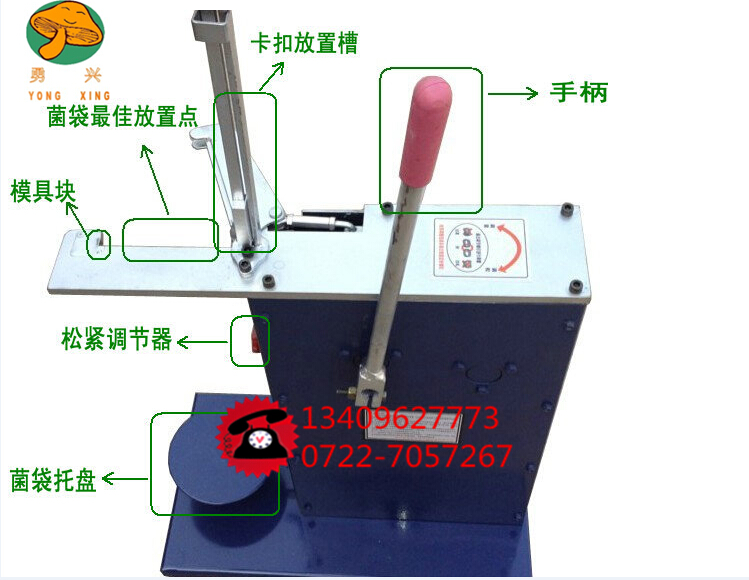 外觀尺寸:63*34*69cm 重量:26KG 速效:900袋/小時(理論值) 該機運用壓力機原理采用傳動機構帶動沖桿對U型卡扣、菌棒袋口、底模進行一次性沖壓成型,使菌棒封口效果好,且封口處松緊可調,各種菌袋均可,非常適用于中小型種植戶使用。 食用菌菌袋扎口工序,一直是比較耗時耗力的。傳統(tǒng)的手工捆扎方式,菌袋往往不能扎緊,形成水袋,造成大量感染。種植戶不僅損失很大,同時人工費用高昂,效率低下。因此,專用的菌袋扎口機械便應運而生了。使用扎口機械,扎口效果獲得極大提高,而速度是手工的十倍以上。經濟效益和社會效益是不言而喻的。 勇興立式扎口機是目前國內最為成熟可靠的菌袋扎口機械。它集合了所有同類產品的優(yōu)點,同時,又巧妙創(chuàng)新設計。使其結構更為簡單牢靠,外觀更為輕便美觀。 首先,本廠在國內,率先采用全電腦數(shù)控加工中心,來加工扎口機面板。銑、鉆、鉸、攻等各個動作,均自動完成。一次裝夾,就可完成全部工序。整個公差控制在半根頭發(fā)絲以內。整塊面板光潔美觀,沒有一個焊點。其精度之高,質量之精細,基本無同行可比。 其次,它采用獨特的雙齒輪齒條設計,使機械運行更加平穩(wěn)可靠。夾袋封口,快捷輕松。封口松緊,也是簡單可調。 最后需要說明的是,本機扎窩,是由高強度硬質合金精制而成?煞磸褪褂冒偃f次以上。從15厘米到25厘米的袋子,均可使用本機扎口。 雄鋒扎口機使用說明: 1,、扎口機開箱,解除固定繩,使齒輪齒條回位。 2、從配件袋中取出手把,手把套為花鍵軸套,可任意角度安裝,以垂直靠后為佳。安裝好后,收緊軸套上的螺絲。 3、安裝下釘桿,以卡扣居中兩邊無阻力為準。 4、調試:取出卡扣,開口朝前,垂直插進下釘桿。搬動手把,使卡扣運動到扎窩;匚皇职,觀察扎窩中的卡扣,以“o"型相互平行交錯為準。過緊或過松,調節(jié)面板前下方機架上的螺絲,順時針松,逆時針緊。調節(jié)好后,將螺桿上的螺母緊固。 5、扎窩每天要用毛刷,清理干凈里面的鋁屑,并保持潤滑。同時,各運動部位也要經常潤滑。 常見問題及解決方案: 1、扎口不緊:調節(jié)松緊螺絲至合適位置,逆時針緊。 2、破袋:三方面問題。第一,卡扣過緊,調節(jié)松緊螺絲,順時針松。第二,裝袋過滿,卡扣從袋中穿過,應裝袋合適。第三,扎口部位有毛刺,應用砂布打磨一下。 3、斜釘:調節(jié)下釘桿的角度,使卡扣與卡槽兩邊平行對等。卡扣剩余十余枚時要及時添加,上面要加壓鐵滑塊,以保持向下重力。 4、斷簧:卸下面板上的五個內六角螺絲,依樣拆下舊簧,換上新簧。 5、扎窩要經常清理潤滑,出現(xiàn)磨損要更換。 6、其它問題,請致電本廠客服,隨時為您解憂。 自動扎口機輕巧耐用、壽命、封口快、不漏氣,適用于菌種及栽培料袋的袋口捆扎作業(yè),且捆扎后的菌袋氣密性好徹底解決手工扎口質量差工效低的難題,采用鋁制卡扣扎口、堅固、不易脫落。自動扎口機的發(fā)明”深受廣大菇農的青睞。工作效率是手工的3-5倍,原先生產10000段菌棒,扎口工序至少需要6-8個民工,現(xiàn)在只要1-2個民工就可以完成。既省時省力,又省錢,而且密封性好,菌棒又不容易因漏氣而受到雜菌感染。每1000段菌棒除購機成本外還可以節(jié)約50多元,此款扎口機做工精致,操作簡單,使用簡單,移動方便,經久耐用,不用動力不用電,手柄操作,快慢自如,使用者的人身安全有保障。主要適用于香菇、銀耳等的打穴接種的菌類品種的扎口作業(yè),自動送釘,效率高,扎口氣密性好,適用于菌種及栽培料袋的袋口捆扎作業(yè),工作效率是手工的3-5倍,且捆扎后的菌袋氣密性好,徹底解決手工扎口質量差,工效低的難題?ǹ墼冢17的用細釘,20以上的用粗釘。扎口用卡扣的鋁材采用高強度鋁鎂合金,硬而不脆,不生銹.扎口緊,不漏氣.菌袋扎口機可以給直徑為: